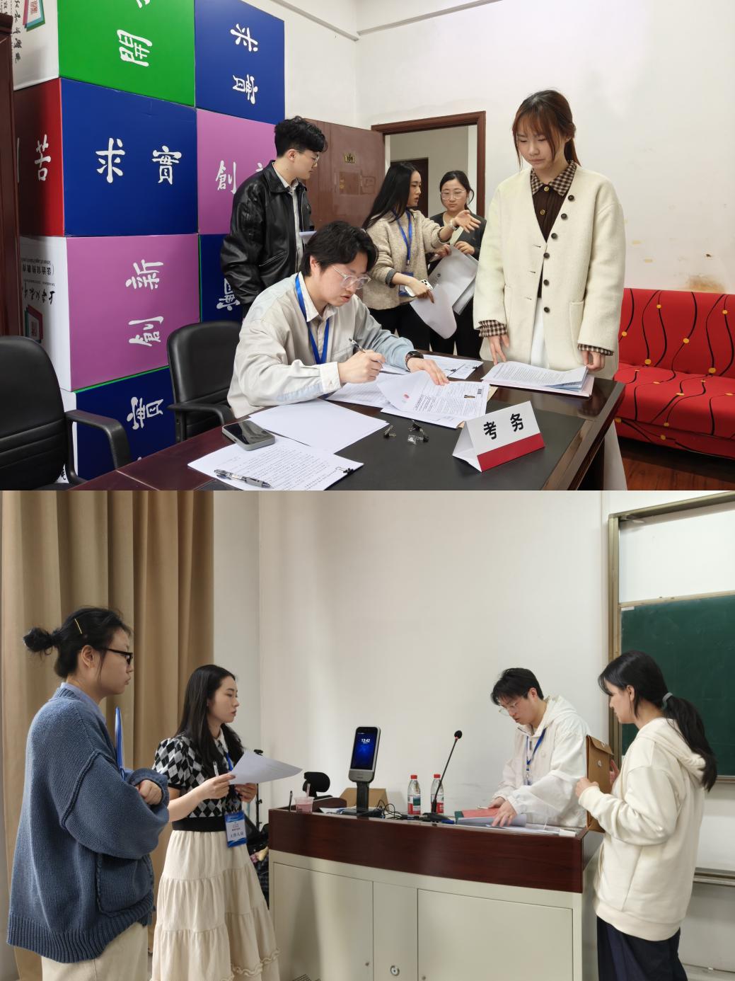 复试现场严格贯彻教育部“两识别”“三随机”“四比对”的工作要求,做好资格审查、身份核验、全程录像等工作,确保复试过程可监控、可再现、可追溯。学院坚持以考生为中心,进一步加强招生信息公开,同时在面试点和候考点积极营造氛围,组织志愿者有序引导现场秩序,为考生提供舒适候考环境,赢得考生及家长一致好评。