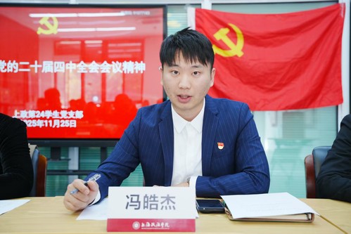 为深入学习宣传贯彻党的二十届四中全会精神,加强青年思想引领,凝聚奋进力量,上政第24学生党支部于2025年11月25日开展党的二十届四中全会精神集体学习暨11月主题党日活动。本次活动以专题学习、研讨为主要形式,旨在引导把学习贯彻党的二十届四中全会精神同学习领会习近平新时代中国特色社会主义思想贯通起来。