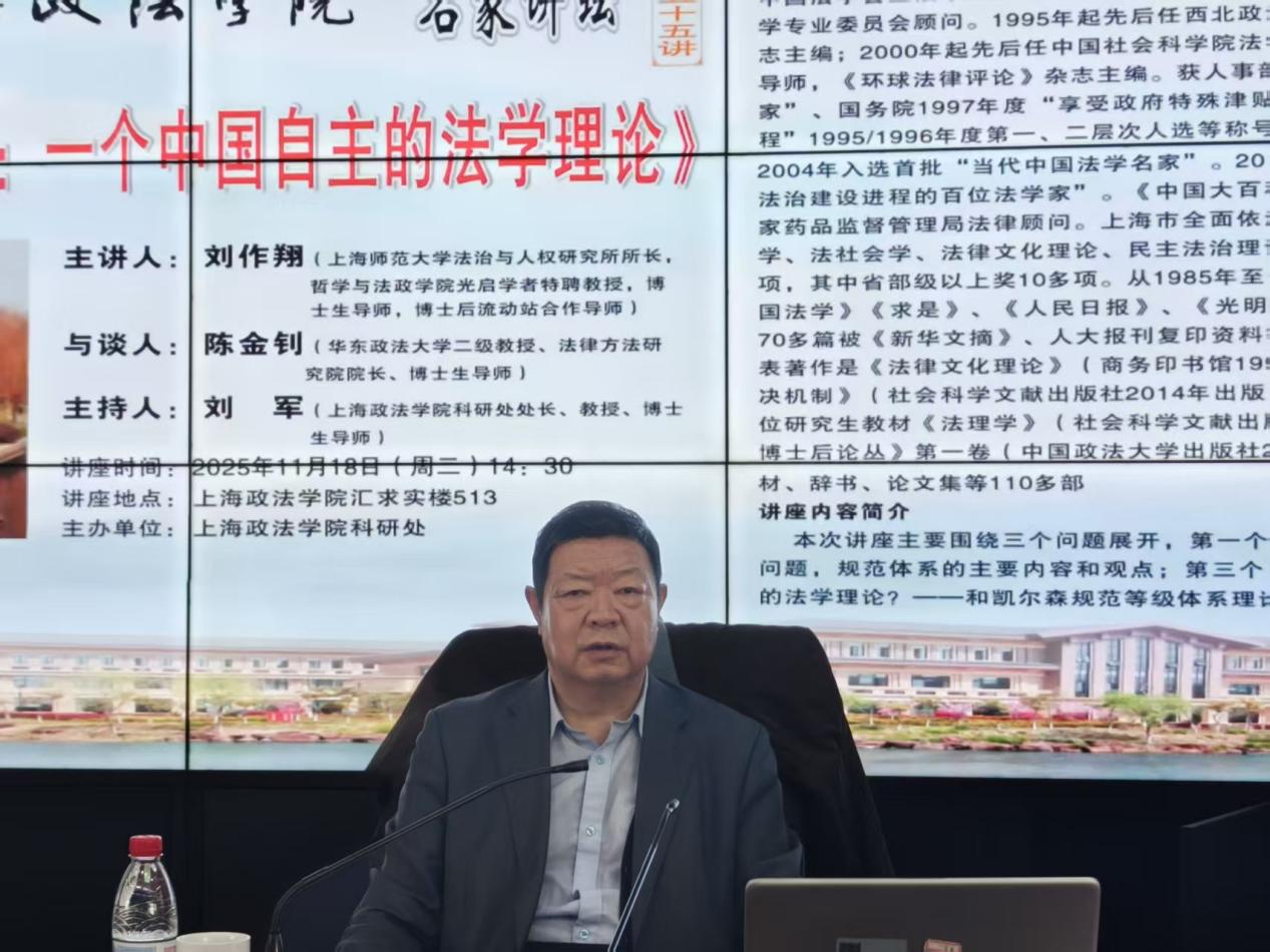 11月18日下午,上海政法学院“名家讲坛”系列的第255讲在求实楼513会议室举办。上海师范大学法治与人权研究所所长,哲学与法政学院光启学者特聘教授,博士生导师,中国法学会法理学研究会副会长刘作翔教授以“规范体系:一个中国自主的法学理论”为题,为在场的师生们带来了一场引人入胜的学术演讲。讲座由上海政法学院科研处处长刘军教授致辞并主持,华东政法大学陈金钊教授参与与谈。