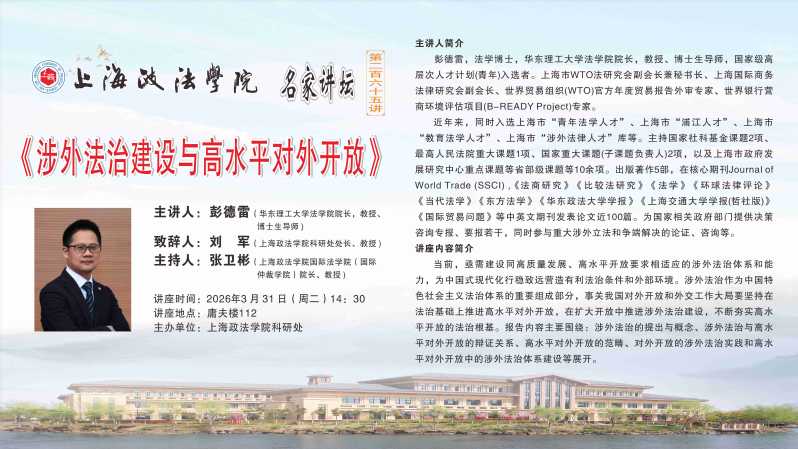 【3月31日 名家讲坛第265讲预告】华东理工大学法学院院长彭德雷教授:涉外法治建设与高水平对外开放