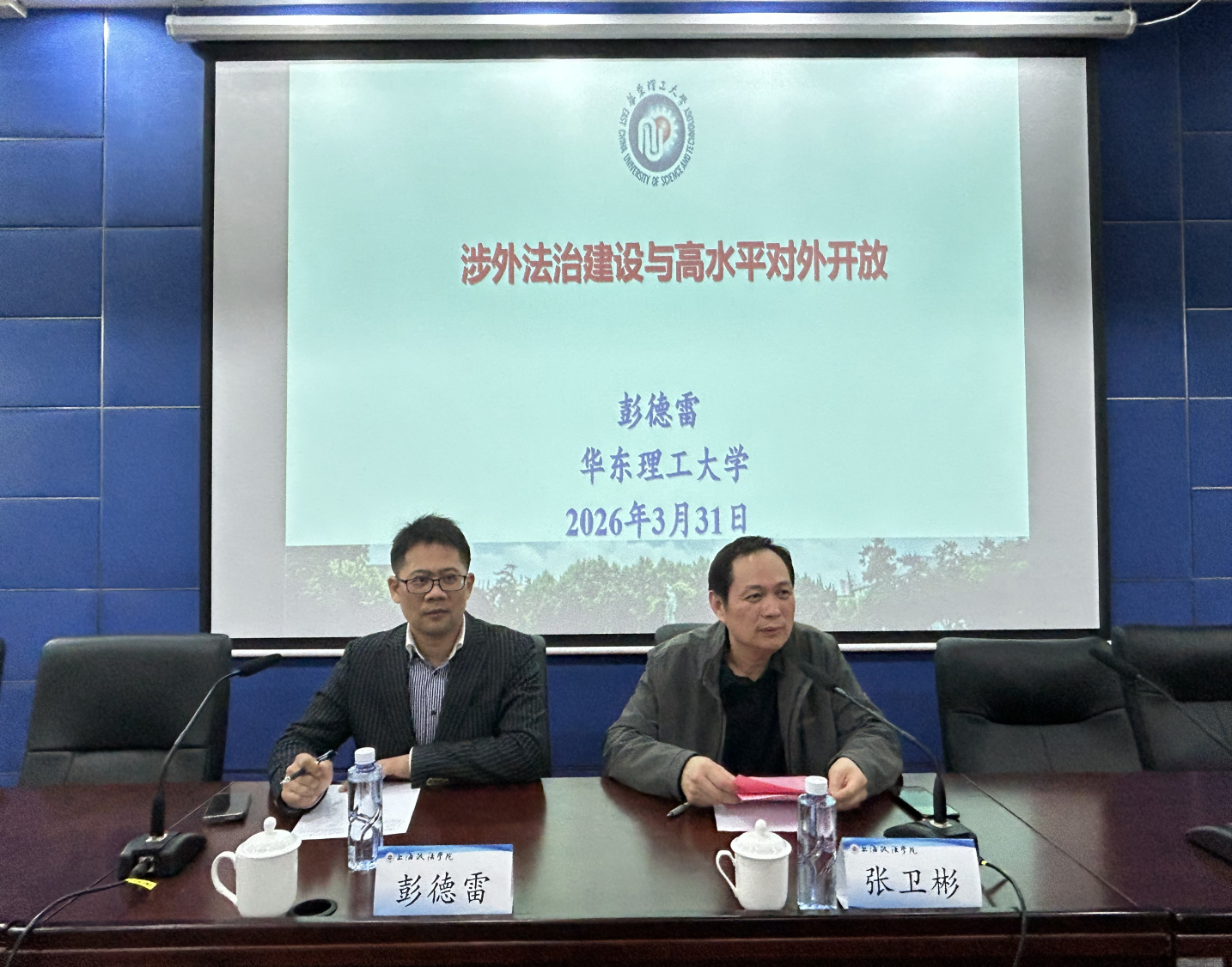 2026年3月31日,上海政法学院名家讲坛第265讲在庸夫楼112室成功举办。本次讲座特邀华东理工大学法学院院长彭德雷教授担任主讲嘉宾,围绕“涉外法治建设与高水平对外开放”展开专题分享。国际法学院院长张卫彬教授主持讲座并致辞,百余名同学到场聆听学习。