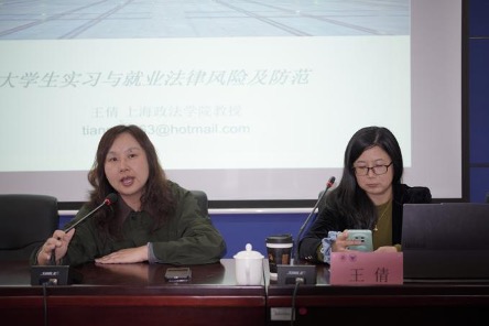 讲座伊始,王倩教授以“洋快餐低薪事件”,引出“大学生是否具有劳动者身份”话题,分析了当代大学生实习与就业过程中常见的身份问题。随后从实习、招聘环节的“陷阱”、就业协议及劳动合同签订等多个方面,向同学们讲解了大学生实习就业相关的一系列法律问题和反诈防骗小知识。