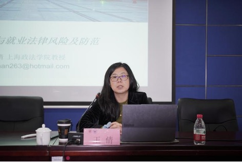 为深入贯彻落实党中央战略部署,强化学生关键阶段的法律保障、护航其职业生涯顺利启航,主动服务学生成长成才的根本需求,2025年11月13日下午,由上海政法学院人工智能法学院主办的以《大学生实习与就业法律风险及防范》为主题的劳动法知识教育专题讲座在庸夫楼112举办。上海政法学院司法研究所教授、中国社会法学研究会理事、知名劳动法专家王倩教授受邀担任主讲嘉宾,由人工智能法学院党总支副书记印晓慧主持,人工智能法学院2022级、2023级、2024级、2025级本科生在内的全校近两百名师生参加学习。
