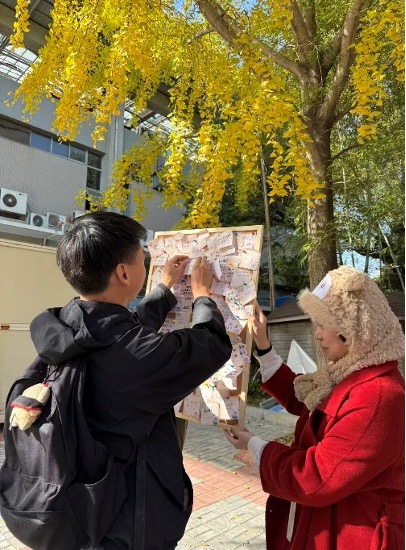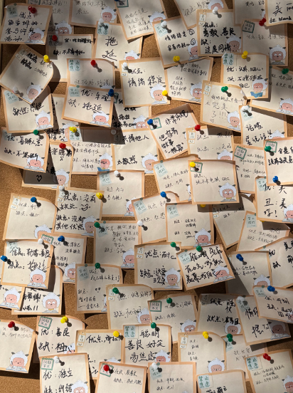 在傍晚,参与留言的同学们回到这里,寻找并取下专属自己的那张小羊便利贴。翻转纸条的瞬间,他们惊喜地发现——每一张便利贴的背面,都多出了来自其他陌生同学的匿名鼓励:“哇,你真的很棒”“太敏感也意味着能够发现身边更多的美好呀”......这些话语成为一只只棒棒的“小羊”之间温暖彼此的桥梁。