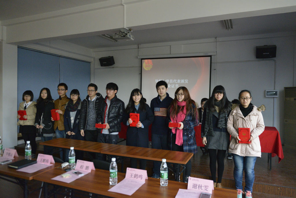 结业仪式在一段视频播放中拉开帷幕。从第一期专题讨论到现在,视频中记录了学员们挥洒汗水、逐步成长的点点滴滴及六位导师的殷切期望与祝福。在奏唱完《中华人民共和国国歌》和《中国共青团团歌》后,组织部部长赵向楠同学总结了第六期团校的基本情况。第六期团校的成长和发展离不开老师和全体学员的积极配合,他希望学员们可以将在团校中学到的知识运用到平时的工作中去。接下来,校团委副书记蒋存耀老师宣读了准许37名学员结业的决定,领导为学员代表颁发结业证书,校团委副书记孙留华老师宣读优秀学员表彰名单并为他们颁发荣誉证书。随后,导师王麒栋学长分享了他担任导师的感悟并鼓励学员要再接再厉。学员代表卫博婧同学分享了她在团校学习中的收获,承诺要将团校所培养的能力运用到团支部建设中。最后,校团委副书记孙留华老师发表讲话。他首先强调了团校老师对第六期团校的重视并对全体学员的表现给予肯定。他同时指出,通过这段时间在团校的学习,希望学员们可以真正理解团队合作的含义,学会承担责任,扛起优秀团干部的重任,在团支书这份工作上将热情进行到底,为团支部更好的建设奉献出自己的青春和热血。