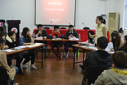 此次辩论赛分为两场。第一场的辩论题目为“大学生毕业后是创业还是找工作”,在主持人阐述相关规则后,一场激烈的辩论赛开始了。首先是支持“创业”方的王子婧同学代表他们的四位辩手进行发言,在其用精炼的语言陈述他们的观点之后,支持“找工作的”周晓卿同学便代表他们方的四位辩手开始反击。辩论赛过程中,双方辩手大胆发言,不断的用己方的论点来争取观众的支持;后排的观众不时的阐述自己的看法来进行辩论;双方的两位队长也不时的对彼此的论点进行反驳、点评以及总结。在一场辩论之后,第一场辩论赛以平局的结果结束;第二场辩论赛的题目为“相亲第一步,你更注重颜值还是内涵”。第二场辩论赛由于辩题开放、新颖,所以吸引了大量的同学踊跃发言,争相辩论,纷纷表达出自己的观点,展示了“自由辩论”的特点。