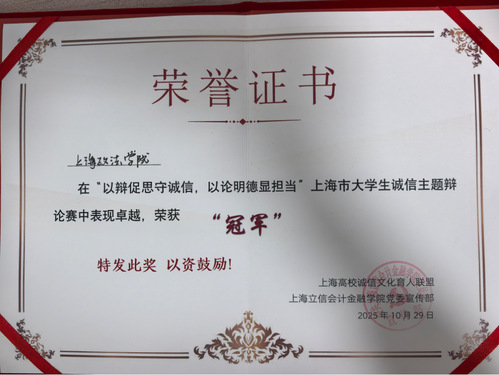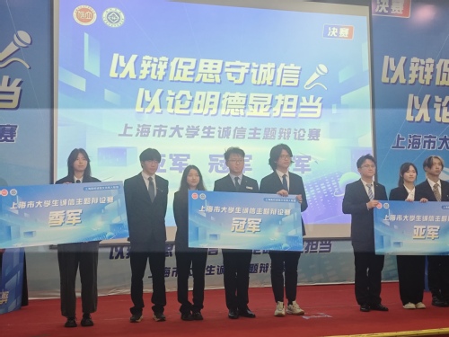 2025年10月29日,上海市大学生诚信主题辩论赛决赛在上海立信金融会计学院举行。我校代表队以卓越的思辨能力、默契的团队协作和沉稳的赛场表现,力压强劲对手华东政法大学代表队,勇夺本次大赛冠军。