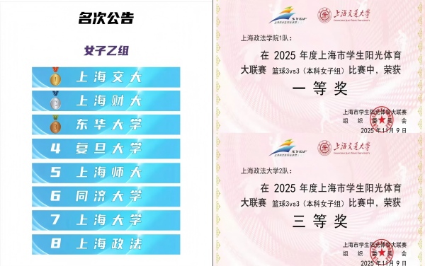 2025年秋季学期,上海政法学院女子篮球队出征两项上海市级篮球赛事,在2025-2026学年上海市大学生篮球联赛及2025年上海市学生阳光体育大联赛三对三篮球比赛中奋勇拼搏,分别取得联赛第八名、三对三比赛一队一等奖与二队三等奖的优异成绩,以赛场实绩展现上政学子的体育素养与团队精神。