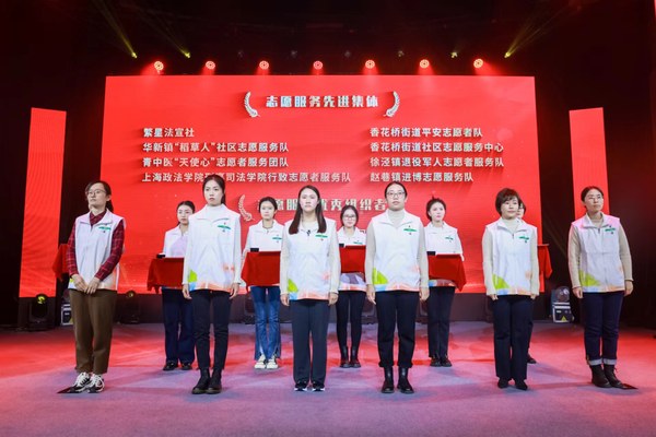 12月14日,“寻找最美四叶草”2023年青浦区服务保障第六届进博会志愿者表彰大会在徐泾镇体育活动中心开展。表彰大会上,刑事司法学院行致志愿者服务队荣获“志愿服务先进集体”称号,10名志愿者队成员获评“优秀志愿者”。青浦团区委副书记杨磊、上海政法学院团委副书记胡飞宇为志愿者代表颁奖并合影留念。