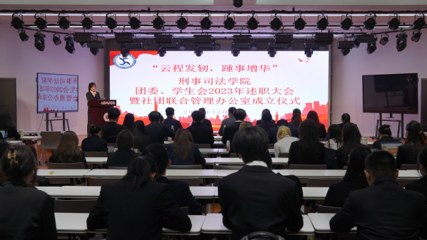 近日,刑事司法学院团委、学生会“云程发韧,踵事增华”2023年述职大会暨社团联合管理办公室成立仪式于成德楼402A举行。刑事司法学院团委书记盛思涵,团委副书记姜雨柔、团委委员秦养锐、学生会主席团成员参加,经济管理学院、政府管理学院、经济法学院的学生会主席团成员受邀出席,团委、学生会各部门负责人及长期志愿者参加本次会议。
