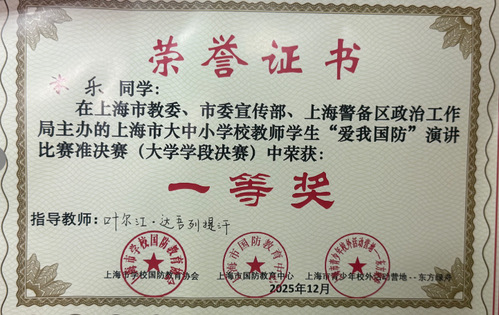 近日,由上海市教委、市委宣传部、上海警备区政治工作局联合主办,上海市青少年校外活动营地——东方绿舟承办的2025学年上海市大中小学教师学生“爱我国防”演讲比赛圆满落幕。我校刑事司法学院刑司24091班米乐同学,凭借其深刻的主题立意、真挚的情感表达和出色的现场发挥,在大学组激烈角逐中脱颖而出,以总排名第一的优异成绩荣获一等奖,展现了上海政法学院学子卓越的综合素养与深厚的家国情怀。