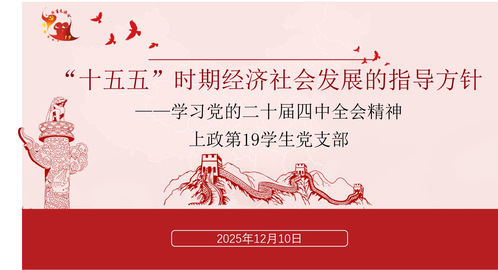 为深入学习贯彻党的二十届四中全会精神,准确领会“十五五”时期经济社会发展指导方针,12月10日,上政第19学生党支部于B3-101,开展“‘十五五’时期经济社会发展的指导方针——学习党的二十届四中全会精神”主题党日活动。活动由李善博主持,全体支部成员参加。