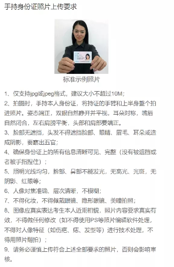 考生须于上述规定时间通过网上确认平台,完成本人的“核对网报信息、上传本人图像照片、上传手持身份证照片、其他补充材料照片以及有效证件照片(需要补充的情况下)”等手续,逾期不再补办。