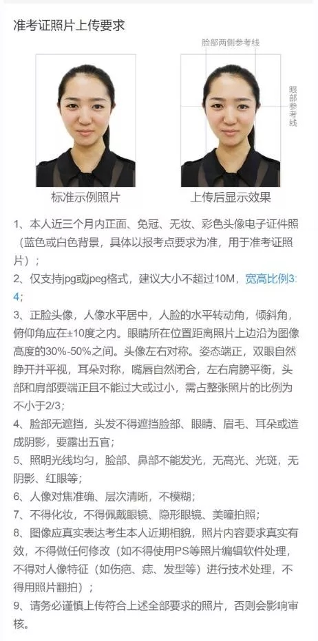 本人近三月内正面、免冠、无妆、无PS、彩色电子证件照,照片要求见下图:
