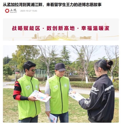 孟加拉国来华留学生王力是学院国际中文教育专业的研究生,也是学校志愿服务队成员。本次进博会,王力以留学生代表身份参加青浦城市文明志愿者出征仪式,并接受澎湃新闻和上观新闻采访。