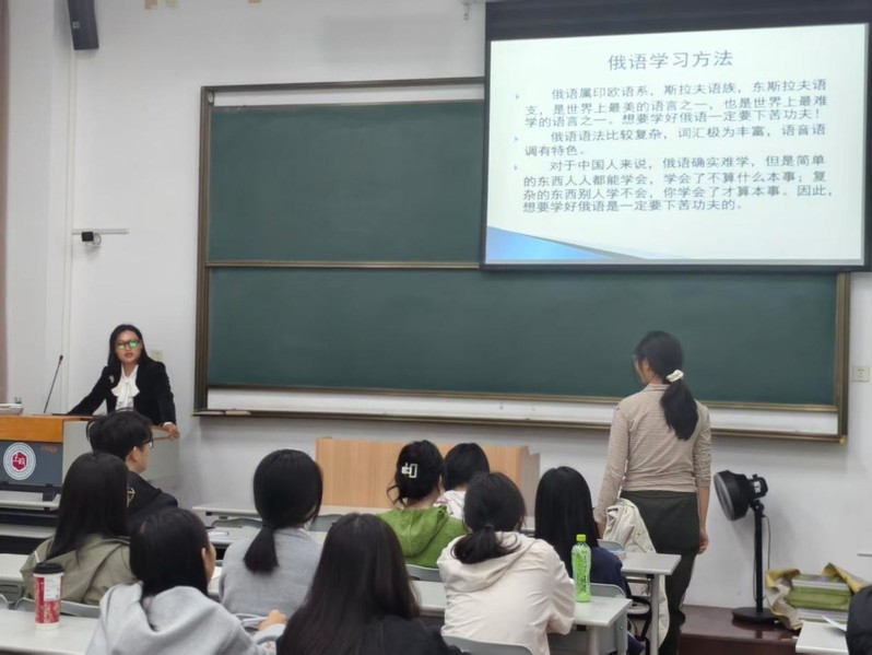 在系统介绍俄语的语言特点时,岳强老师指出,俄语作为印欧语系中最具代表性的曲折语之一,语法体系复杂、词形变化丰富,是“世界上最美的语言之一,也是最难学的语言之一”。她以数词“一”具有24种变化、动词变化高达172种为例,生动说明了俄语学习的挑战性。但她强调,“复杂的东西别人学不会,你学会了才算本事”,鼓励同学们迎难而上,勤学苦练。