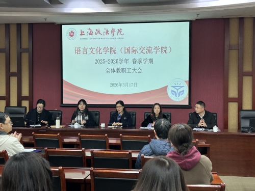 3月17日下午,语言文化学院(国际交流学院)于综合研究中心107会议室召开2025—2026学年春季学期第一次全体教职工大会。会议由党总支副书记(主持工作)周怡主持,学院领导班子成员依次传达上级工作部署、通报学院近期各项工作进展、部署新学期重点任务,学院全体教职工参会。
