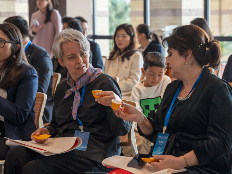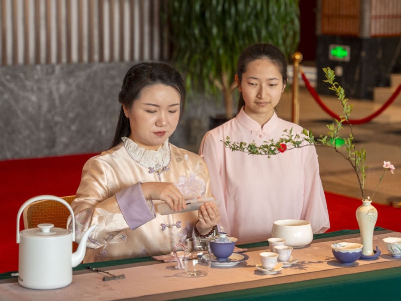 活动期间,上海市茶叶学会副理事长兼秘书长方茵女士担任文化讲解嘉宾,系统阐释了茶道精神与外交礼仪之间的内在联系。国宾茶礼仪队成员以两人为一组,依“举案齐眉”之礼,逐一向嘉宾奉茶。她们目光平视、双手端持、仪态端正,将《礼记》所载“九容”规范融入举止之间,充分展现了中国青年学子卓越的礼仪素养与深厚的文化自信。