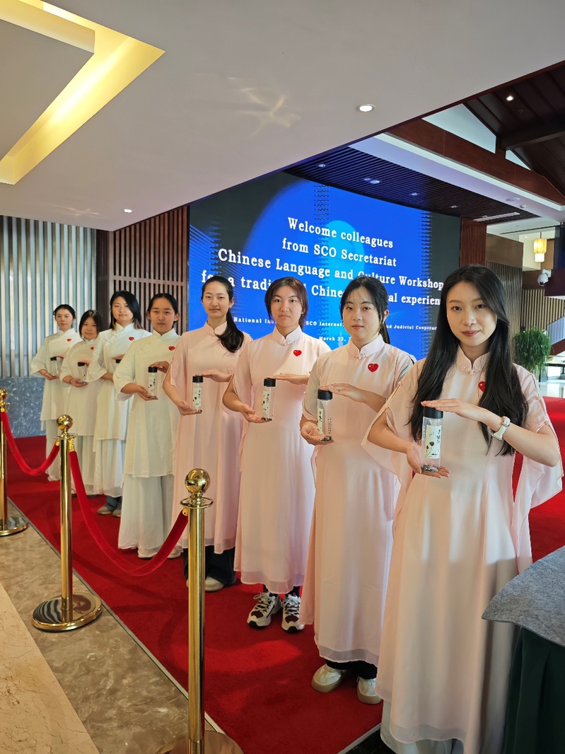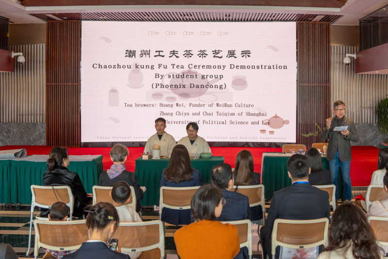 3月22日,上海合作组织秘书处中国语言文化研修班代表团到访中国—上海司法培训基地,参与中国传统文化体验活动。语言文化学院(国际交流学院)朴归茶道社国宾茶礼仪队负责本次活动的茶事服务与礼仪展示工作,凭借专业的茶艺技艺与规范的礼宾礼仪,为国际友人呈现了一场高雅别致的文化盛宴。
