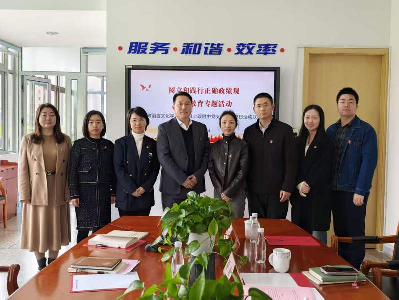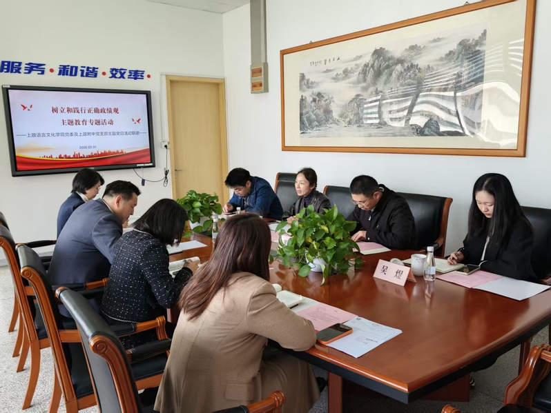 2026年3月31日,语言文化学院(国际交流学院)党委与上海政法学院附属青浦崧淀中学党支部联合举办“树立和践行正确政绩观”联组学习会,并将学习研讨与“访企拓岗促就业”专项行动紧密结合,共同探索“大-中”学段协同育人、贯通培养、服务学生长远发展的新路径。会议由附中党支部副书记陶芳琴主持,学院党委副书记(主持工作)周怡,副书记魏洲阳,附中党支部书记、校长毛金华等双方教师代表出席。