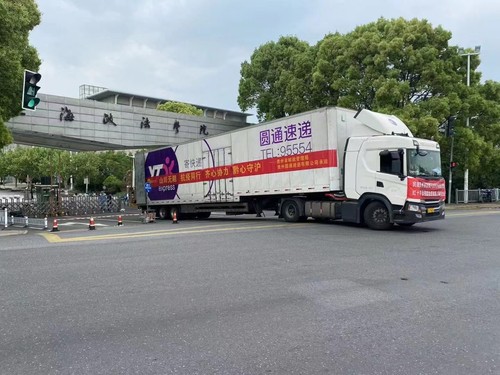 悬挂着的“山海情深,同心抗疫”的横幅,运输货车从贵州出发,驰援千里抵达上海,展现了黔沪两地深深的情谊。此次捐赠的物资包括:口罩、隔离衣、防护服、生活用品、食品等,总计价值73.49余元,将会全部用于上海政法学院的疫情防控工作。