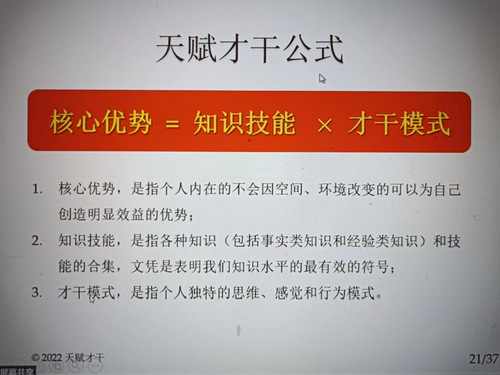 其次,倪老师对个人核心优势的本质进行了详细讲解,内容涵盖天赋才干公式、才干优势理论四大方程式等,并通过职场案例将公式具体化。此外,倪老师分别解释职场核心能力的四部分,即战略思维力、影响力、关系构建力、执行力。互动环节中,倪波老师以简单明了的方式解释才干模式随年龄增长的变化问题,并鼓励同学们用优势打造精彩人生。