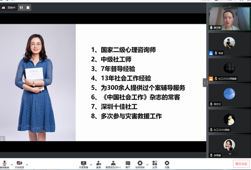 一直以来,我校社会工作专业要求学生“既要埋头学专业知识,又要抬头看行业发展”。作为中国特色社会主义先行示范区,深圳社会工作是中国社会工作行业发展的前沿区和示范区。在本次讲座中,唐老师首先简单介绍了一下深圳社工的大致发展情况,然后唐老师先介绍了深圳社会工作的基本情况,有社工服务机构、社工人才队伍、社工服务岗位设置与项目覆盖、社工服务领域及社工服务成效等五方面。随后,唐老师将深圳社工的创新实践从五方面做了讲解,分别为制度先行,系统建构,探索本土实践模式;深化服务,加强保障,坚持专业化职业化发展路径;创新示范,辐射全国,建立对外交流机制;全面落实《若干措施》,推动社会工作跨越式发展;全体投入,紧密配合,积极参与新冠肺炎防控工作。最后唐老师用一句话与同学们共勉,即“用生命影响生命!”,充分体现了社会工作的专业价值,也是每一位社会工作者希望且正在做的事。