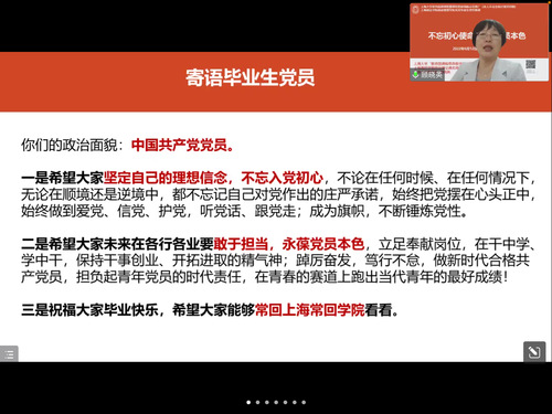 最后,顾晓英寄语全体毕业生党员,希望大家坚定自己的理想信念,不忘入党初心;未来在各行各业勇于担当,永葆党员本色,做新时代合格共产党员,担负起青年党员的时代责任。(张志怡撰稿)