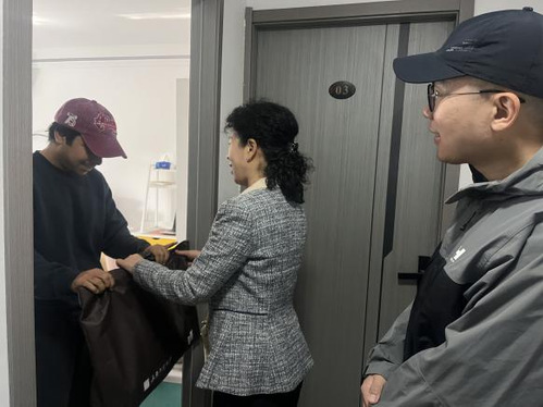 为深入了解在校外住宿留学生的实际生活状况,加强对留学生的关怀与管理,2025年10月17日上午,学院党委书记姚善英率领学生工作负责人杨铠、留学生辅导员吕静怡、魏宇凡、苏力旦江·帕塔尔,共同前往留学生校外住宿点,亲切慰问了来自俄罗斯、阿富汗等国的留学生代表。