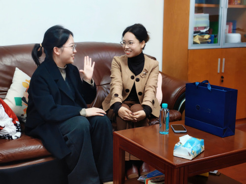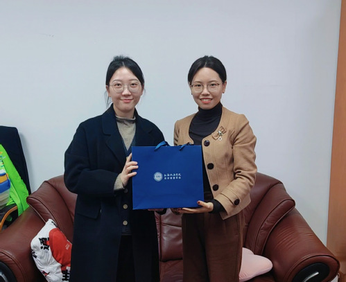 辅导员鲁冰清介绍我院学科优势,未来,双方将依托各自资源优势,在学生实习、志愿活动等方面开展合作,助力学院就业工作提质增效。会后,辅导员鲁冰清为郁梦琦颁发校友纪念品。