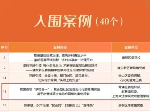 3月12日,第三届上海城市基层党建创新案例征集活动推荐案例名单正式发布,由青浦区委组织部、赵巷镇党委、上海政法学院政府管理学院基层治理团队联合实施并申报的《党建引领“多格合一”:复合型社区治理现代化的青浦实践——基于赵巷镇环宝龙综合网格的案例探索》成功入围。此次入围不仅展现了青浦区党建引领基层治理的鲜活经验,更凸显了高校团队深度参与基层实践、赋能治理创新的独特价值。