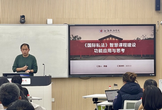 蔡鑫分享的主题是《<国际私法>智慧课程建设的功能应用与思考》,他围绕《国际私法》智慧课程建设,介绍了课程在数字化转型背景下的建设思路与实践路径,通过知识图谱、问题图谱与能力图谱重构教学内容体系,依托智慧教学平台整合多类型教学资源,并引入AI助教与智能评价机制,推动教学由“结果导向”向“过程与能力并重”转型,展示了AI在案例分析、互动教学与个性化学习中的应用成效。课程对技术应用边界与人工校准问题进行了反思,为法学课程的智慧化建设提供了可借鉴经验。