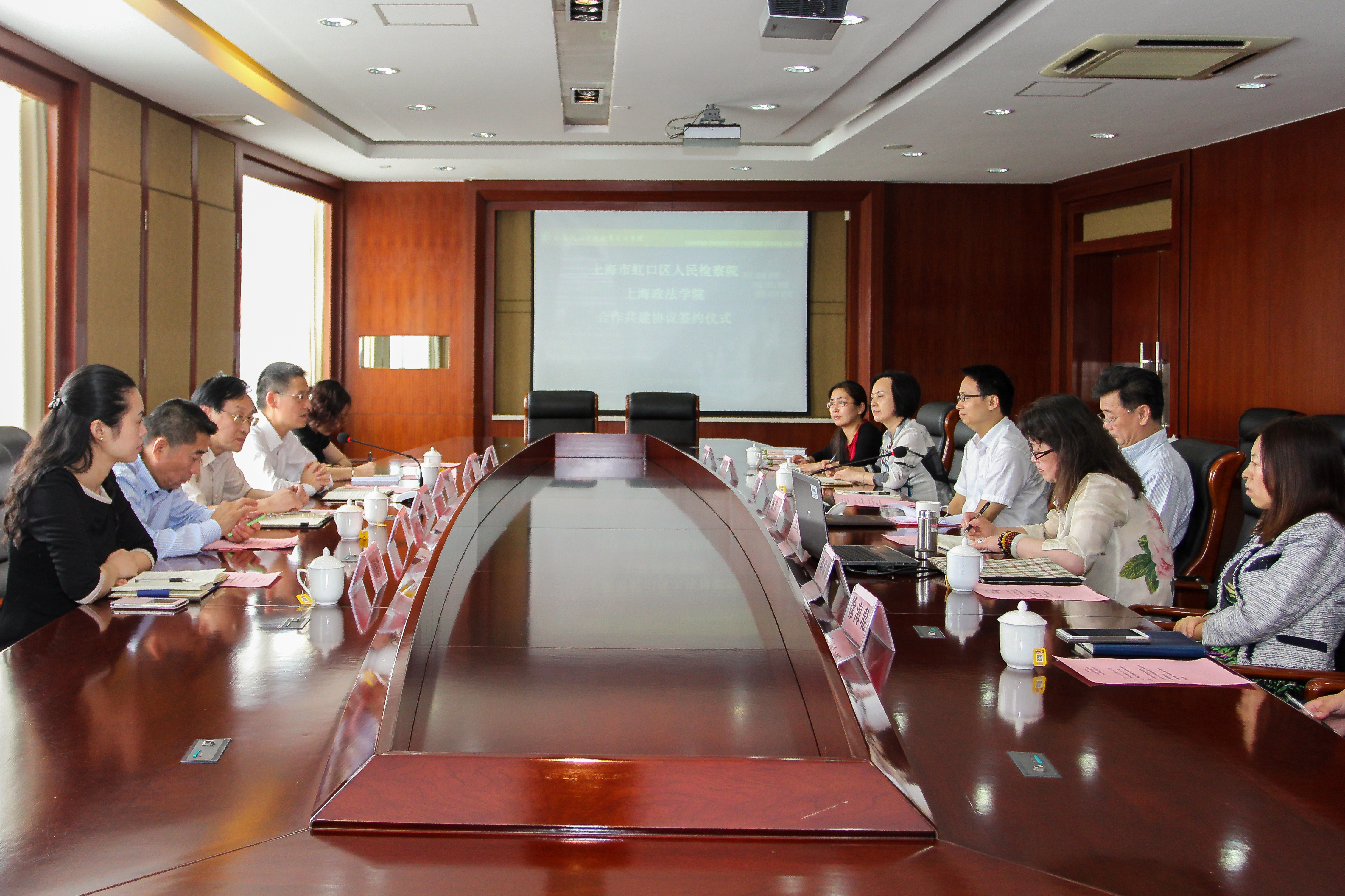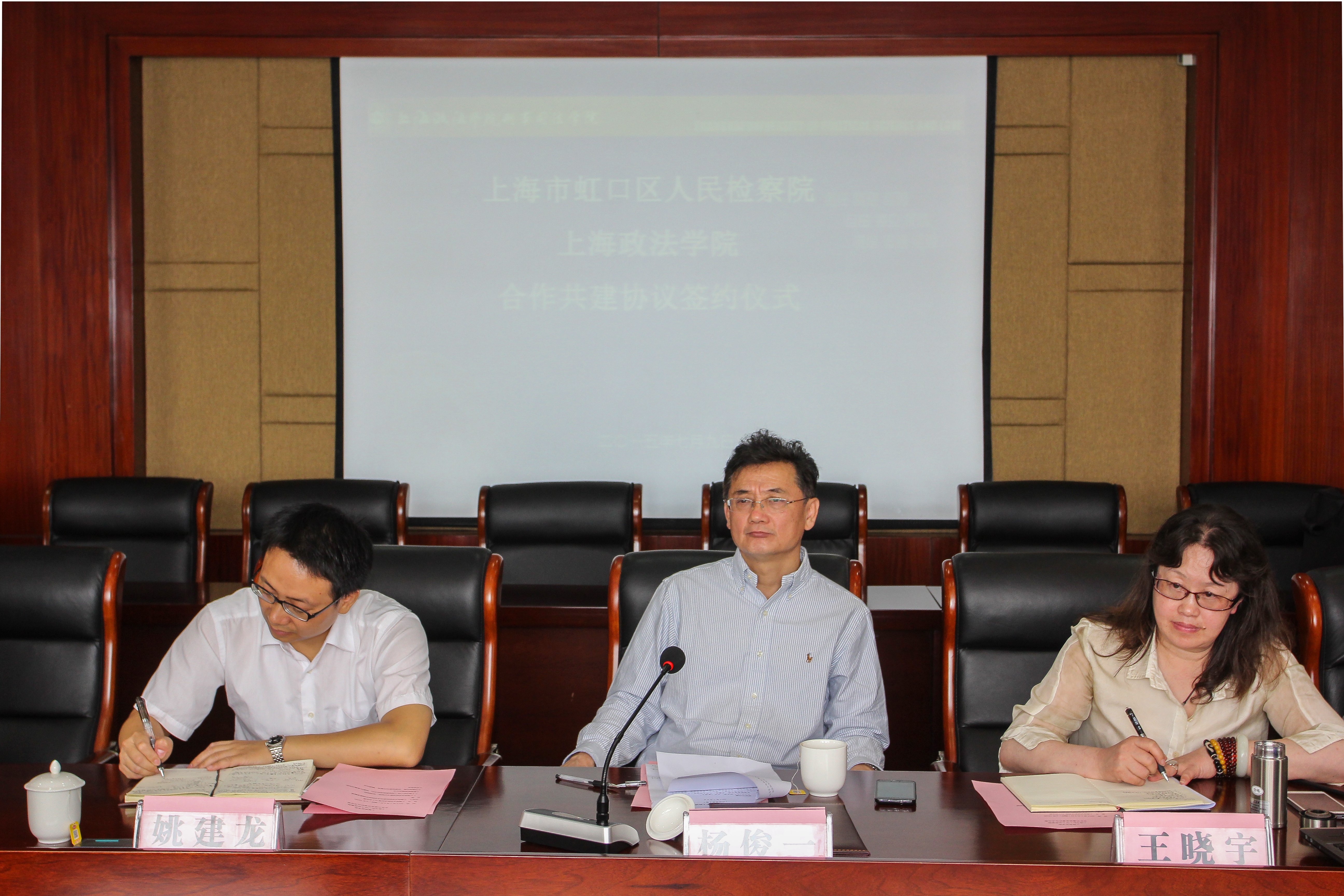 7月9日上午,我校与上海市虹口区人民检察院合作共建签约仪式在求实楼413会议室隆重举行,上海市虹口区人民检察院党组书记、检察长金建庆,副检察长田欢忠,政治部主任肖蓉辉,检委会专委张建,研究室主任顾静微等嘉宾,我校党委书记杨俊一教授出席,校合作发展处处长王晓宇、刑事司法学院党总支书记胡冠时、副院长刘瑞瑞教授,学工负责人徐海琨以及刑法教研室王娜副教授参加活动。活动由刑事司法学院院长姚建龙教授主持。