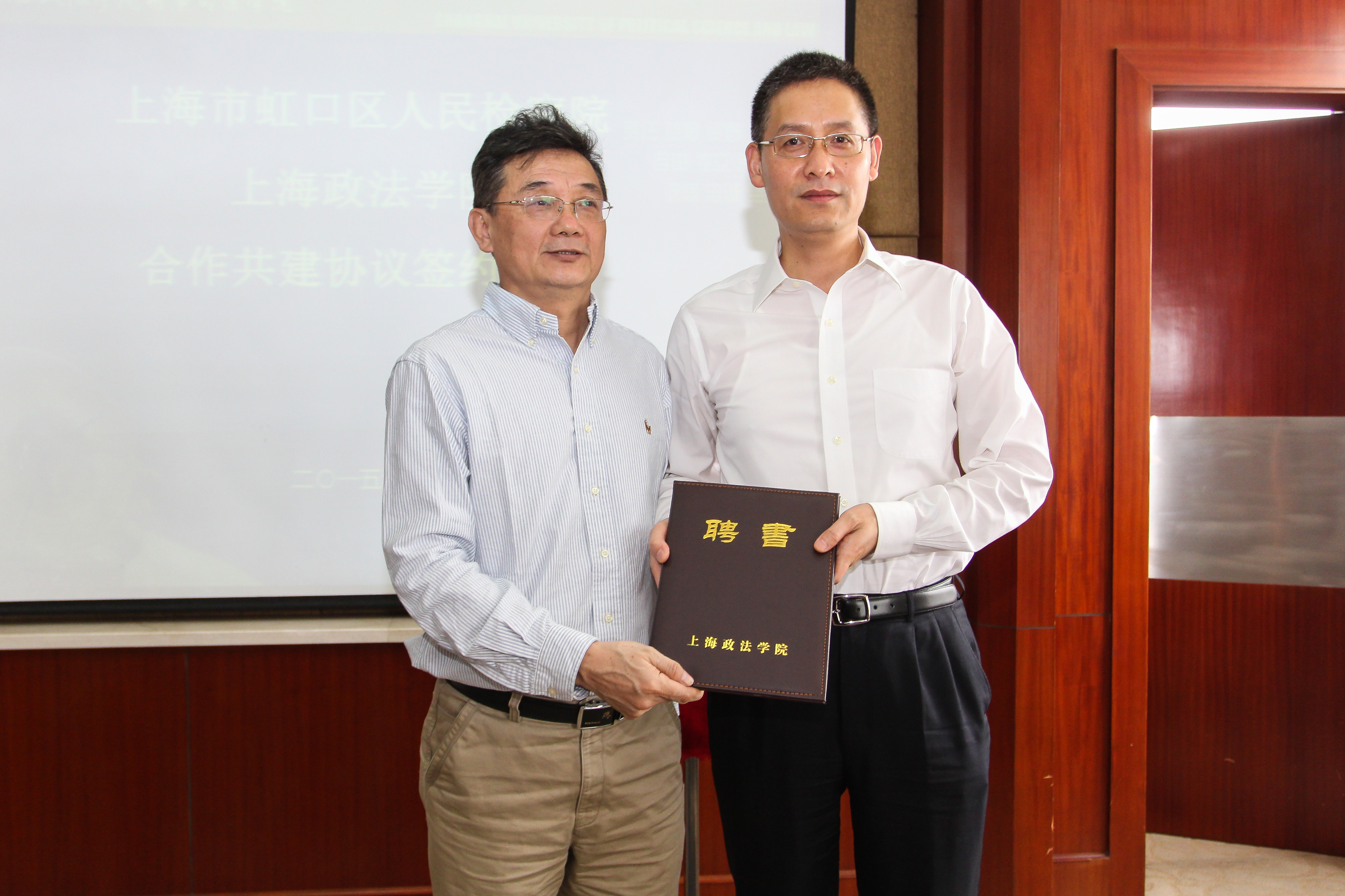 随后,杨俊一书记代表学校向金建庆检察长颁发了上海政法学院客座教授聘书,两位领导分别在合作共建协议上签字并为“刑事检察合作基地”揭牌。